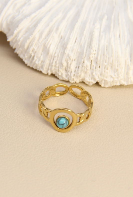 Cette bague allie le charme d’une chaîne graphique à une pierre naturelle centrale.