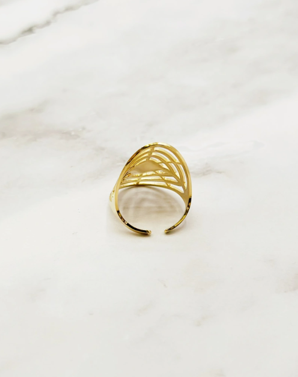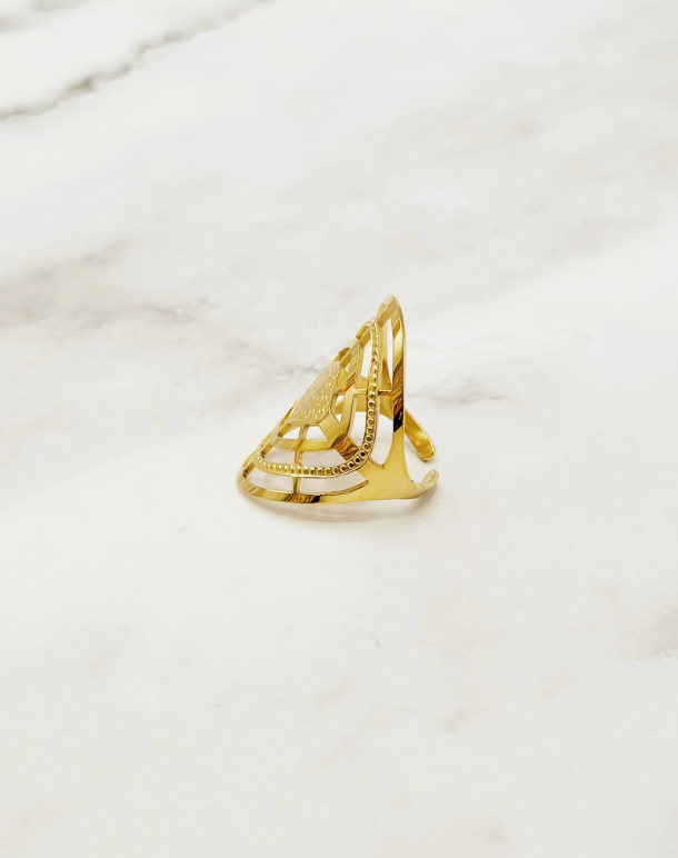 Cette bague imposante se distingue par son design géométrique audacieux et ajouré (3*2cm).