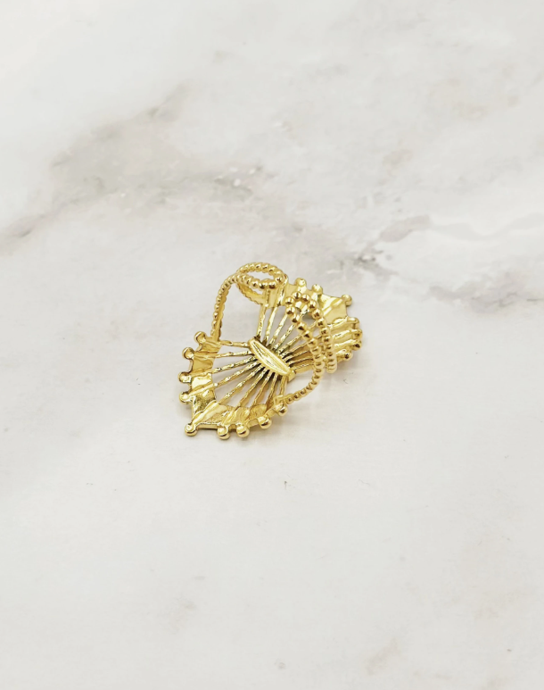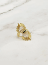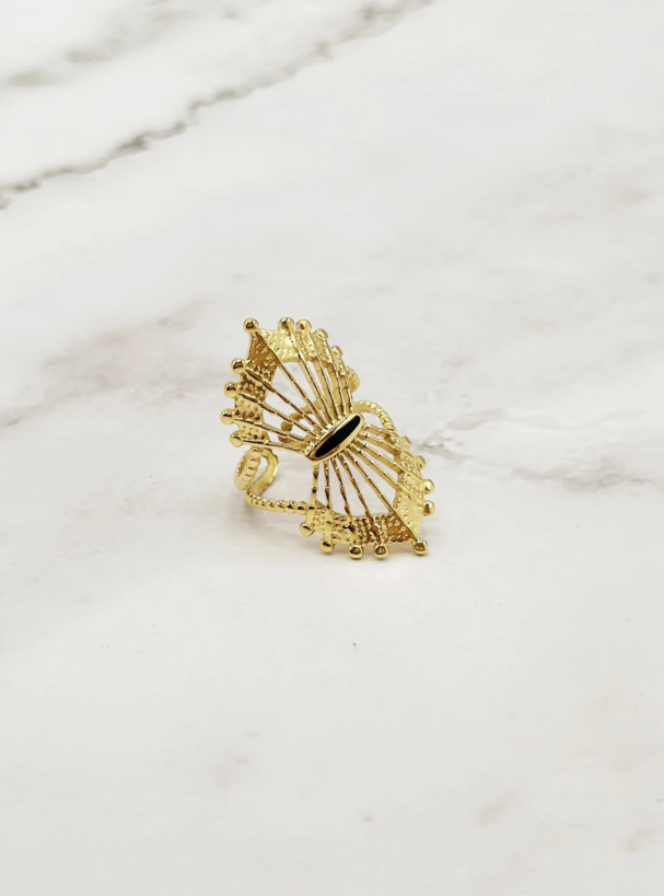 Cette bague ajustable dorée se distingue par son design audacieux en forme d’éventail rayonnant.