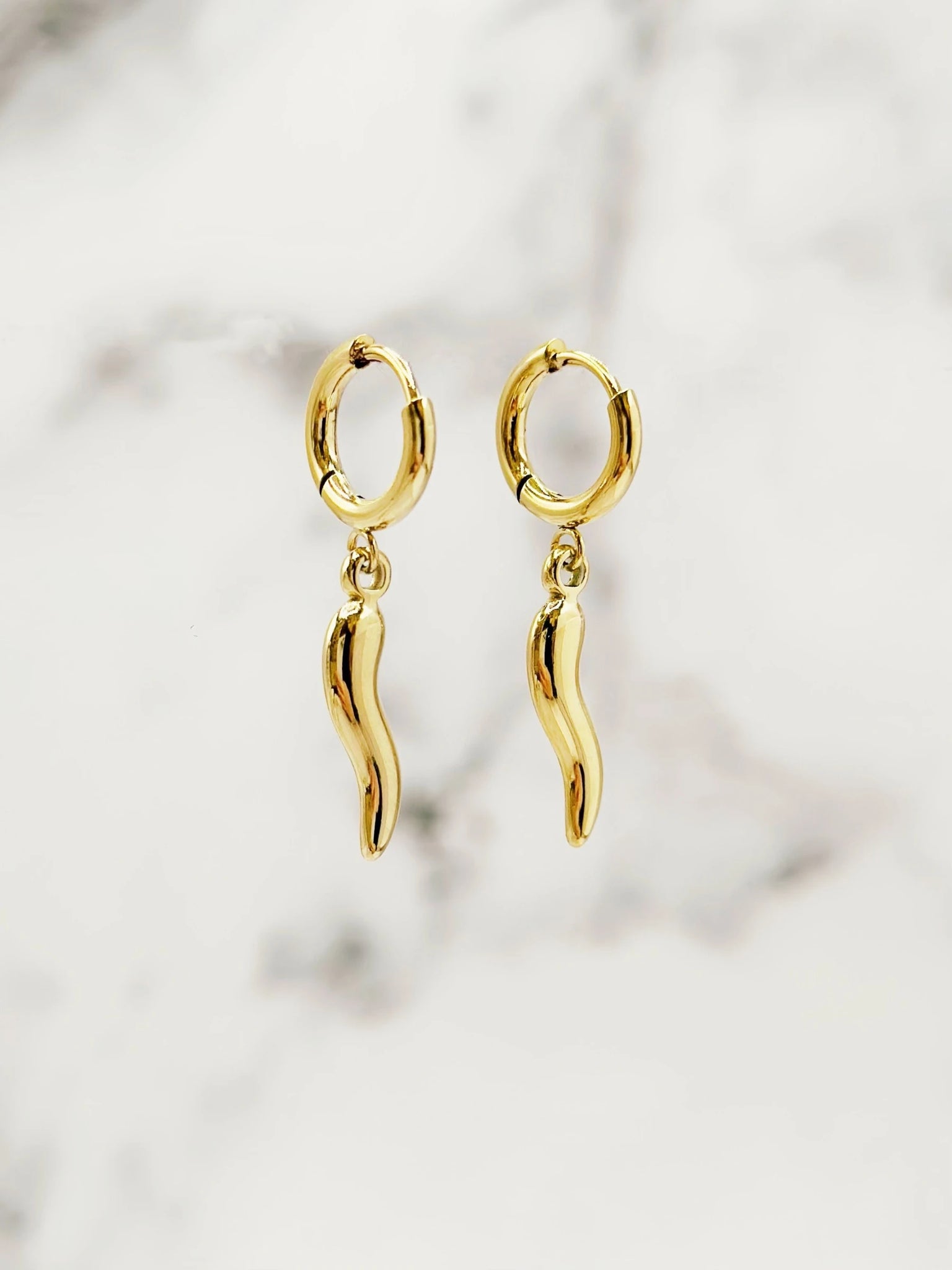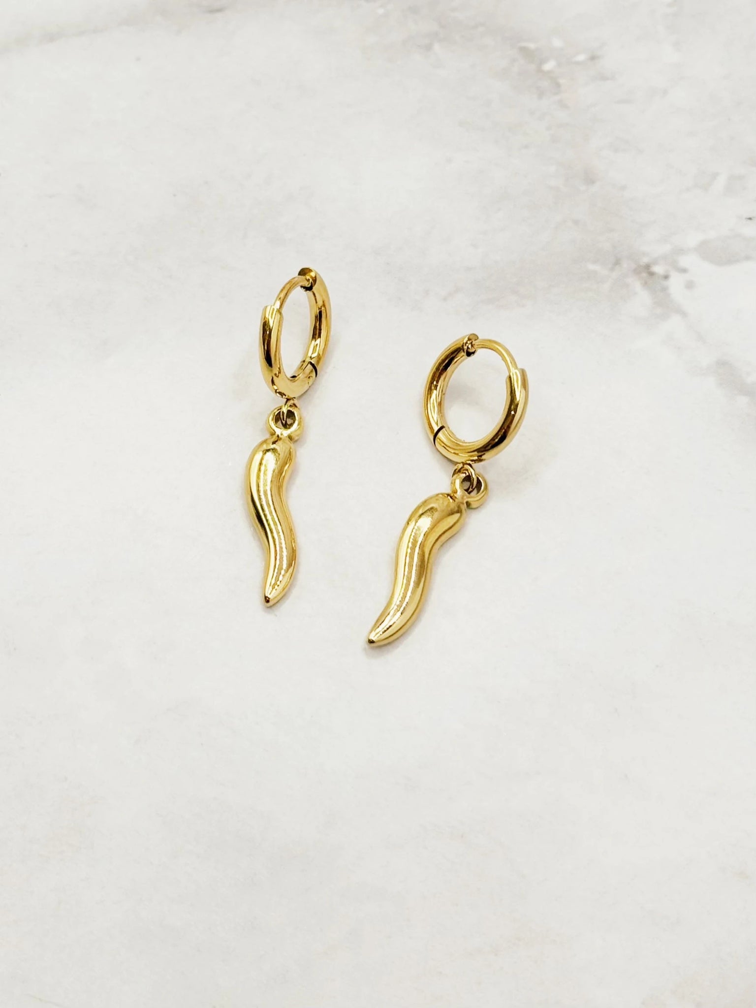 Ces boucles d’oreilles créoles en acier inoxydable doré arborent un pendentif en forme de piment, symbole de chance et de protection dans de nombreuses cultures.