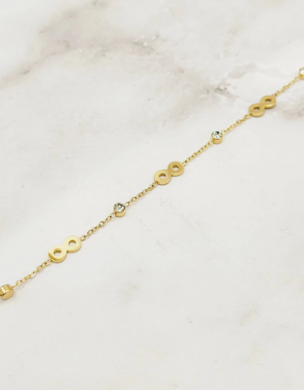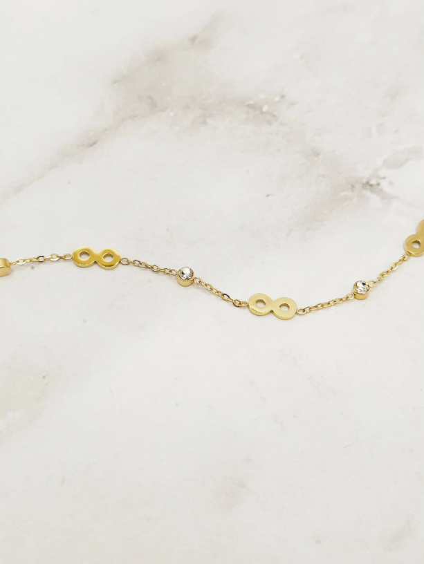 Ce bracelet raffiné en acier inoxydable doré est orné de symboles infini délicats, symbolisant l'éternité et l'amour sans fin.