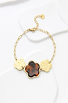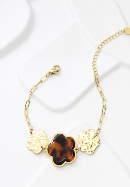 Sublimez vos looks avec ce bracelet raffiné en acier inoxydable doré, orné d’une fleur centrale effet écaille, encadrée par deux motifs martelés pour une touche artisanale et moderne. Son design unique mêle la brillance de l’acier doré à la chaleur des nuances brunes, offrant un bijou à la fois élégant et tendance.
