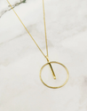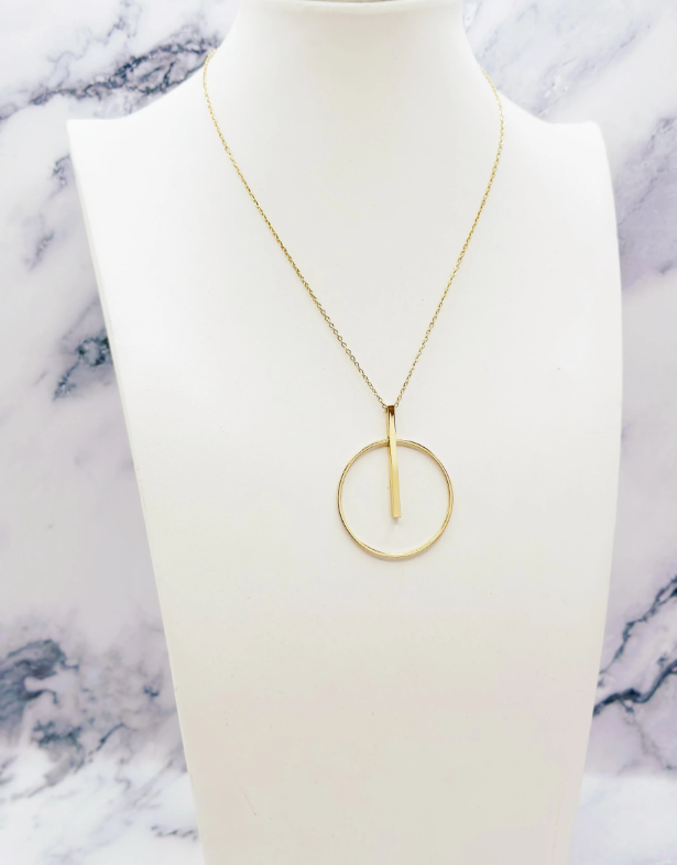 Collier minimaliste en acier inoxydable doré, orné d’un pendentif graphique formé d’un cercle traversé par une barre verticale, pour un style épuré et contemporain