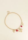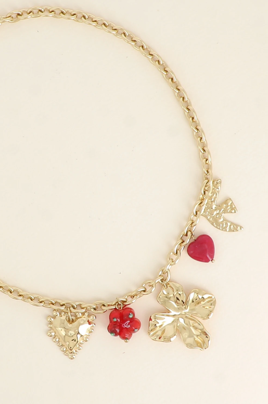 Collier sur chaîne en acier inoxydable composé de feuillage, fleur, coeurs et oiseau.