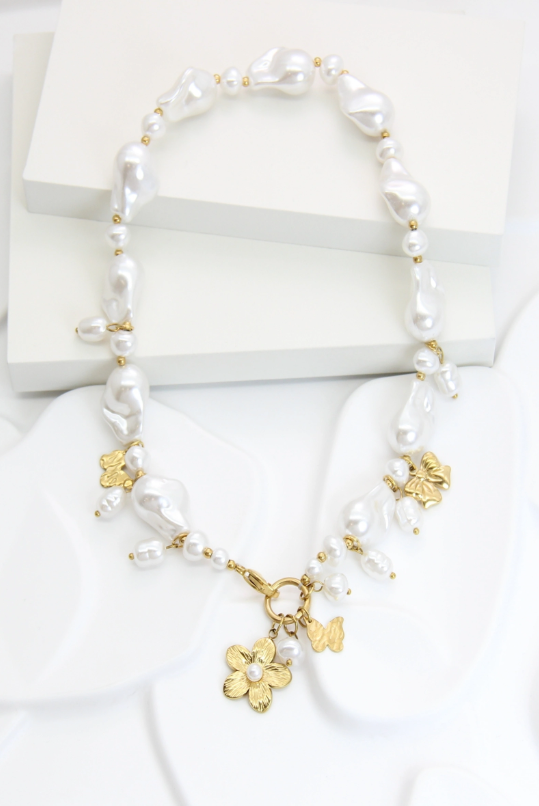 Ce collier élégant marie la douceur des perles blanches irrégulières à l’éclat des charms dorés.