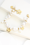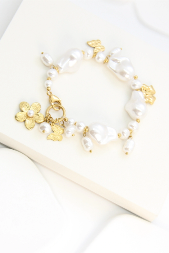 Élégant et raffiné, ce bracelet associe la douceur des perles blanches irrégulières à l’éclat des charms dorés.
