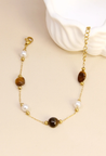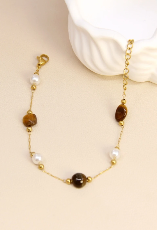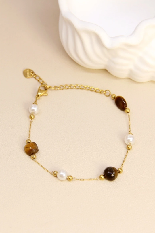Ce bracelet en acier inoxydable doré marie la puissance naturelle de la pierre œil de tigre à la douceur des perles blanches.