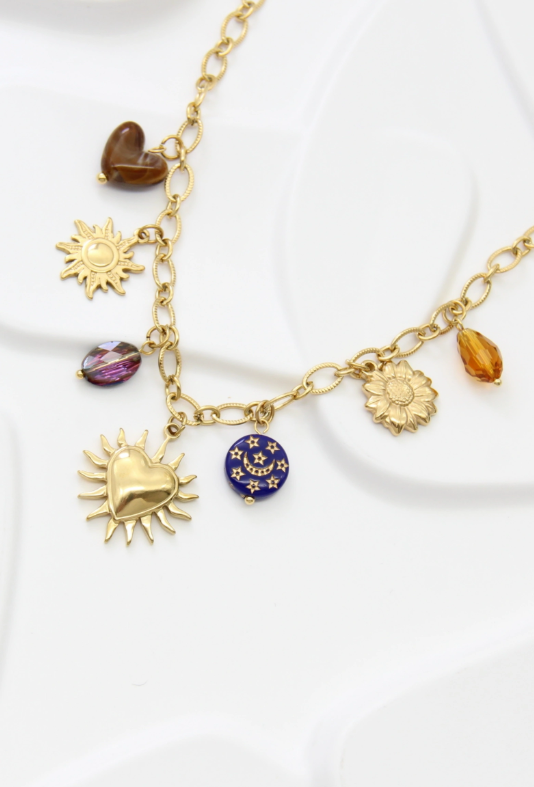 Ce collier en acier inoxydable doré se distingue par sa chaîne à maillons élégants ornée de pendentifs symboliques : soleil, lune étoilée, fleur, cœur rayonnant et pierres colorées.