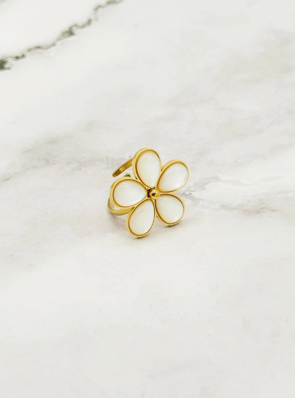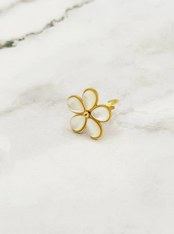 Montée sur une bague ajustable en acier inoxydable doré, elle s’adapte à toutes les tailles et vous accompagne au quotidien avec une allure florale chic