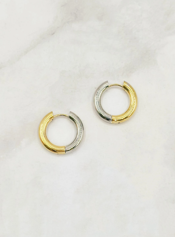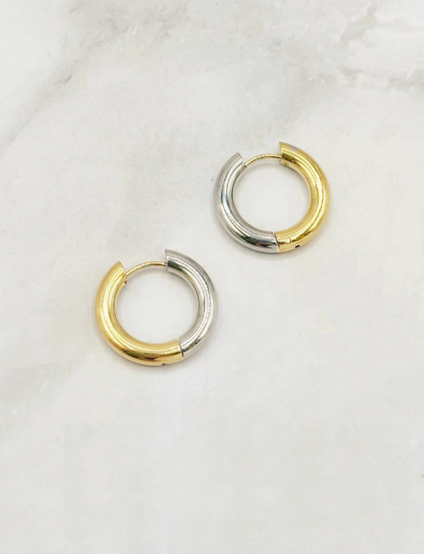 Ces boucles d’oreilles créoles en acier inoxydable bicolore offrent une esthétique à la fois moderne et intemporelle.