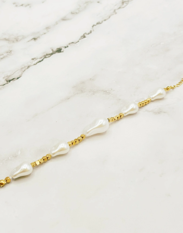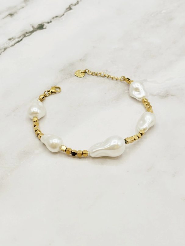 Ce bracelet raffiné en acier inoxydable doré se distingue par ses élégantes perles baroques blanches, délicatement intercalées avec des perles dorées hexagonales.