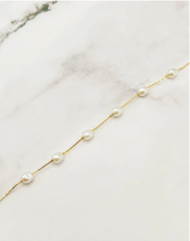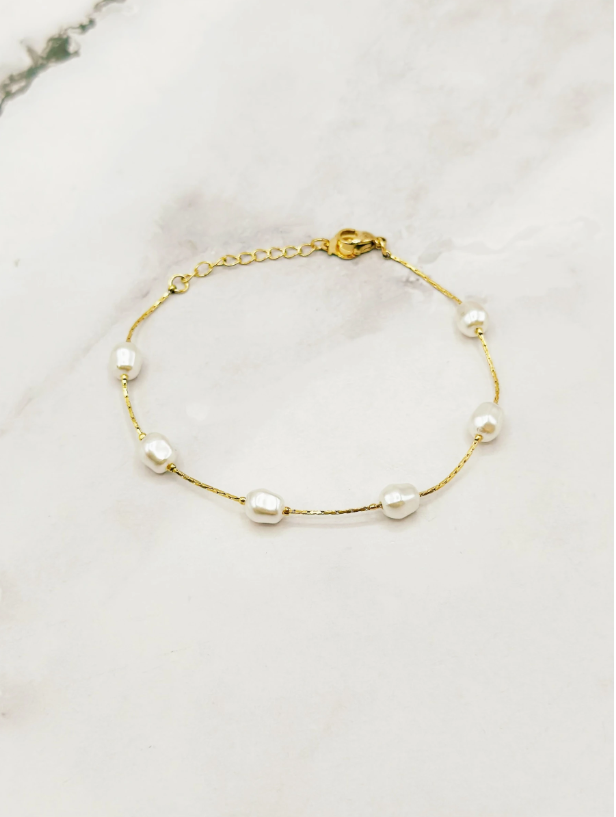 Minimaliste et élégant, ce bracelet en acier doré est rehaussé de perles blanches espacées avec régularité sur une fine chaîne torsadée.