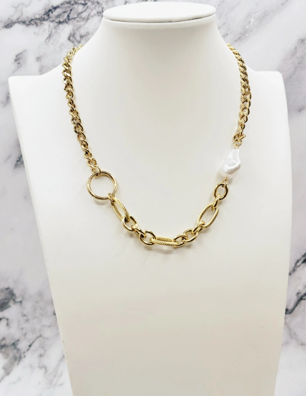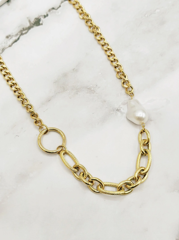 Ce magnifique collier allie la robustesse d'une chaîne dorée à la délicatesse d'une perle d'eau douce baroque.