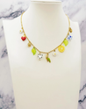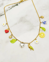 Un collier plein de fraîcheur et de gaieté, orné de charms colorés et ludiques : fraise émaillée, fleur blanche, feuille verte, tranche de citron, cœur à pois, perroquet, soleil doré et perle bleue.