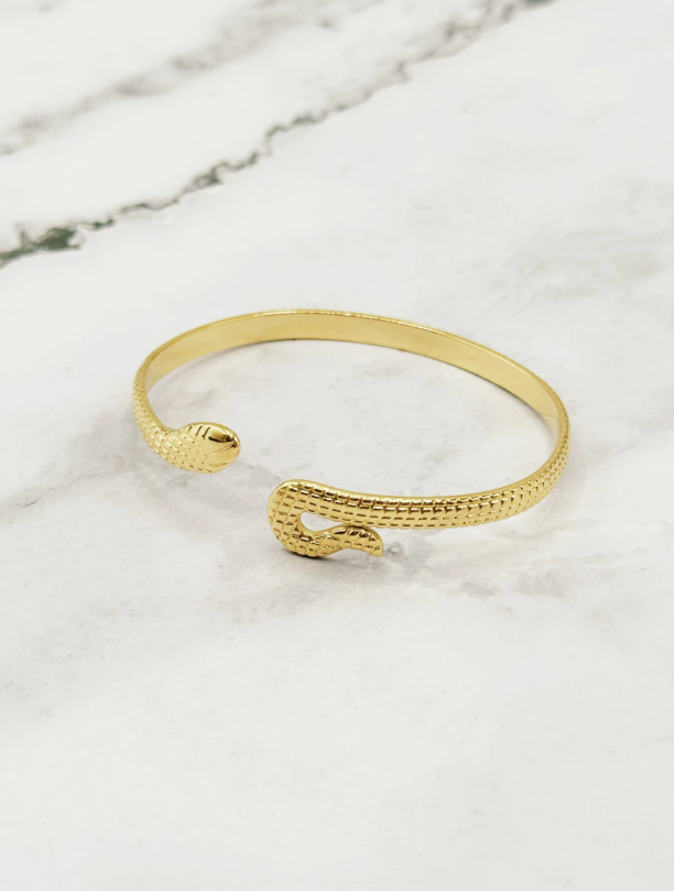 Élégant et audacieux, ce bracelet jonc en acier inoxydable doré adopte une forme ouverte inspirée d’un serpent enroulé.