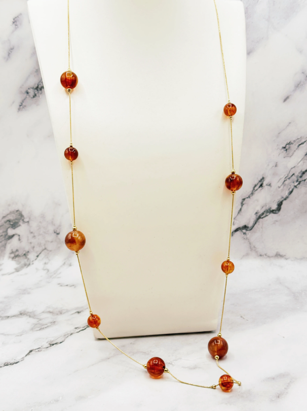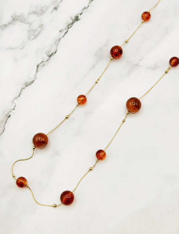 Cette pièce légère et ajustable présente des perles ambrées espacées qui flottent gracieusement le long d'une fine chaîne, créant une silhouette fluide et lumineuse.